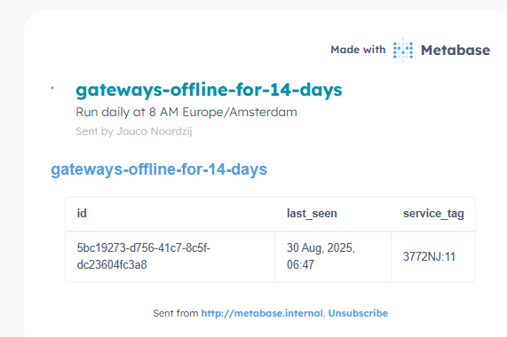 Email is sent to support when there are modems which are offline for more than 14 days.