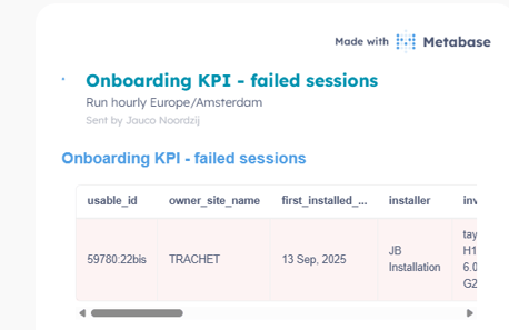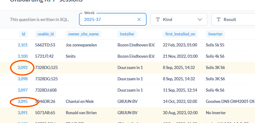 - Check the status of the site and look into metabase sequence ( go to Metabase --> Onboarding KPI --> fill in the year and the week number " 2025-37" --> for new Installation put filter "N" (for re-occuring "R") --> Play , Press on the ID.