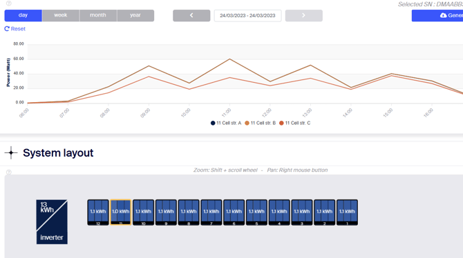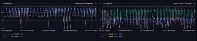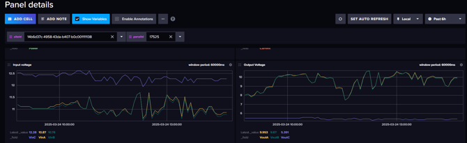 - Login to influx to check panel performances. In this particular case it is seen that Vin of one string is higher than others, and Vout is significantly lower. Replace the CSO\Panel