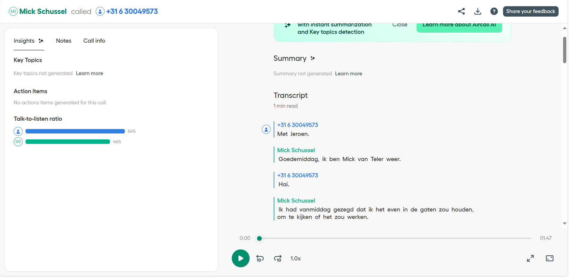 Aircall utilizes a feature where it can transcribe your conversations in Dutch. To access this, navigate to the conversation center, go through the list of calls to the call you want to find information on and click' preview', then 'go to conversation'. Here you will find the transcript feature.